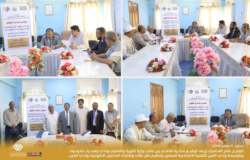 جاء توقيع المذكرة برعاية كريمة من وكيل محافظة حضرموت لشؤون مديريات الوادي والصحراء الأستاذ عامر سعيد العامري، الذي عمّد المذكرة مؤكدًا على أهمية تعزيز التكامل بين المؤسسات الحكومية والمجتمعية لخدمة التعليم وتوفير البيئة المناسبة للطلاب لمواصلة تعليمهم بانتظام. مشيدًا بالدور الإيجابي الذي تقوم به مؤسسة وادي العين في دعم التعليم والمجالات الأخرى. مؤكداً أن مثل هذه المبادرات تمثل نموذجاً يحتذى به في تعزيز المسؤولية المجتمعية، وترسيخ الوعي بأهمية التعليم باعتباره الركيزة الأساسية لبناء الإنسان وتنمية المجتمع.