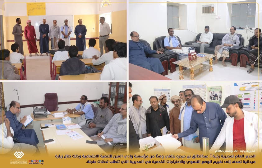 في إطار تعزيز الشراكة مع الجهات المحلية وتحديد أولويات التنمية في المديريات، التقى المدير العام لمديرية رخية الأستاذ عبدالخالق أحمد بن حيدرة اليوم وفدًا من مؤسسة وادي العين للتنمية الاجتماعية برئاسة الأستاذ سالم الحداد، وذلك خلال زيارة ميدانية تهدف إلى تقييم الوضع التنموي والاحتياجات الخدمية في المديرية.