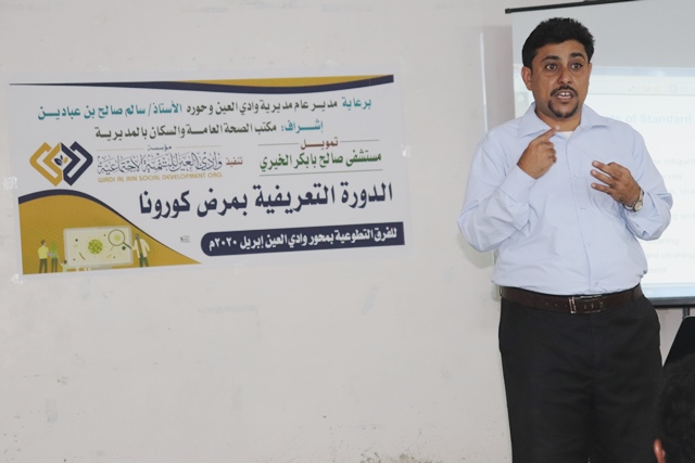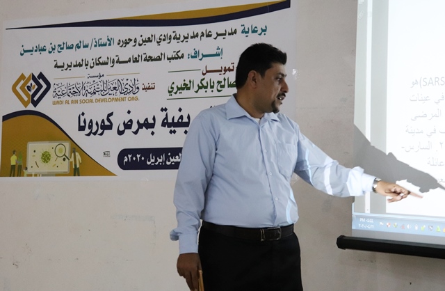 بمحور وادي العين قدّم خلالها سعيد أبوبكر باوزير عدة محاور هامة شملت نبذة تعريفية عن فيروس كورونا وكيفية انتقاله وانتشار العدوى بين الناس وكيف تحمي نفسك من الآخرين ومن هم أكثر الناس عرضه للمرض .